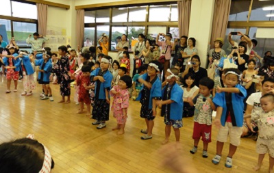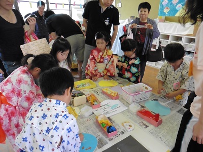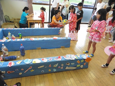 ヨーヨーつり・きんぎょすくい・わなげ・ボーリング・くじでお面をもらったり、質問に答えてお菓子をもらったり、制作コーナーではうちわを作りました。会の最後には先生たちの出し物や子どもたちの踊り「にんにん忍たま音頭」もありました。2部のしろ組さんはバンブー太鼓を披露しました。