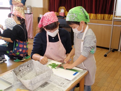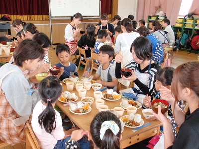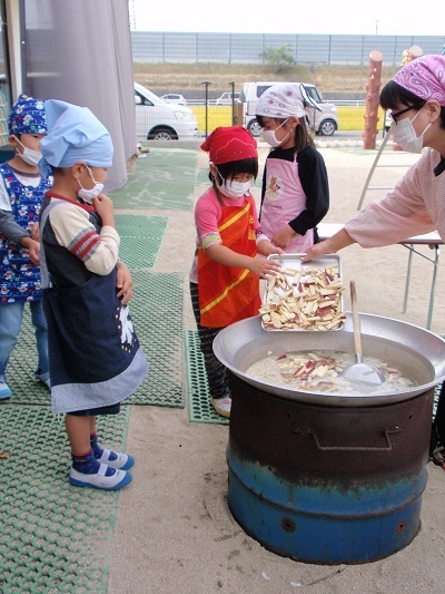 園庭に設置した大鍋で煮込み、美味しい豚汁が出来上がりました。