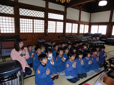年長組の子どもたちは、本堂でお参りをしました。