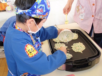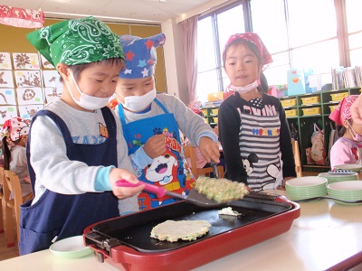 しろ組さんとふじ組さんがお好み焼きを作りました。